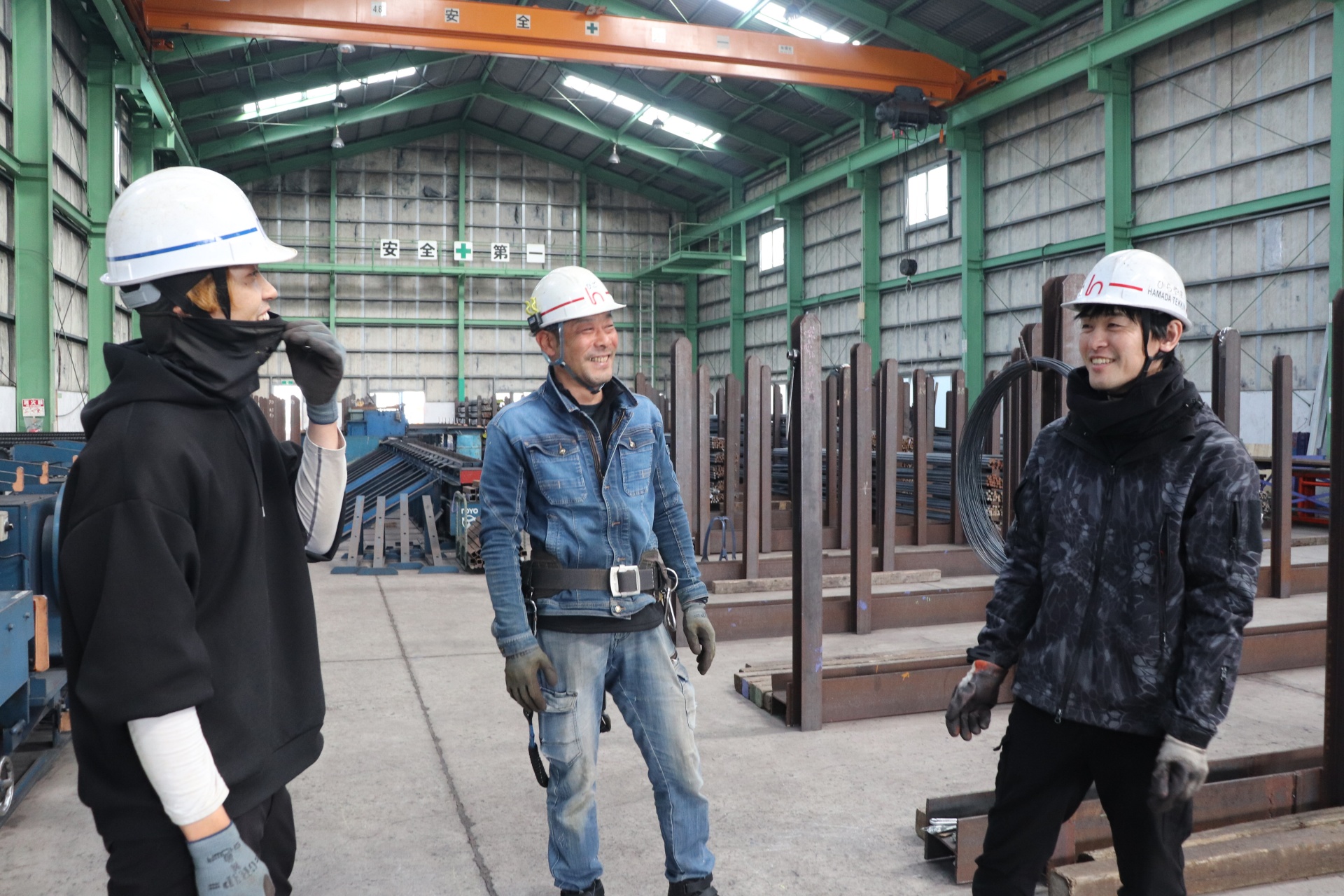 2017年入社の肥後(写真中央)は、前職は大型トラック運転手でした。体を動かすことが好きだったので現場関係の仕事に転職を決意しました。「入社当初、薩摩川内市甑島の『甑大橋』のビッグプロジェクトに配属し、終わった時の達成感が大きかったですね」と言います。「資格取得をするための費用は会社が全額負担で、2級鉄筋施工技能士を取得しました。そして2024年3月に1級も合格できました。さらに取得後は会社から毎月手当がついています。とてもありがたいですよね。プライベートでは、新築のマイホームを購入しました。仕事は17時に終わることや、土日休みで子どもたちと出かける時間が作れるので、私生活も充実しています。」